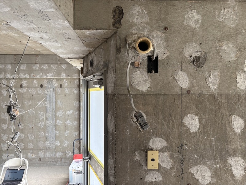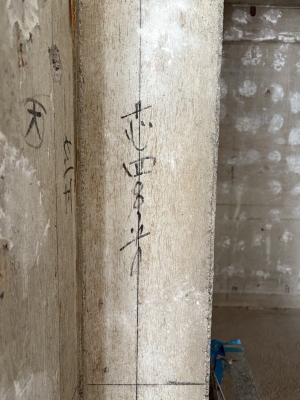 今回は「墨出し」という作業も終わっていたため壁のあちらこちらに壁芯を表す線が見えます。