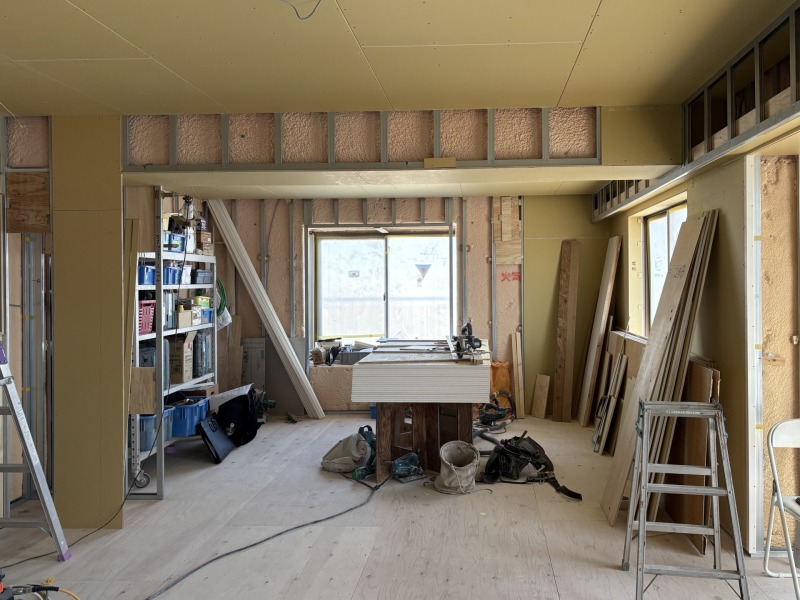 「大倉山の家」の工事が着々と進んでいますが、ついに床、壁、天井のボードの工事も終わりに差し掛かっています。